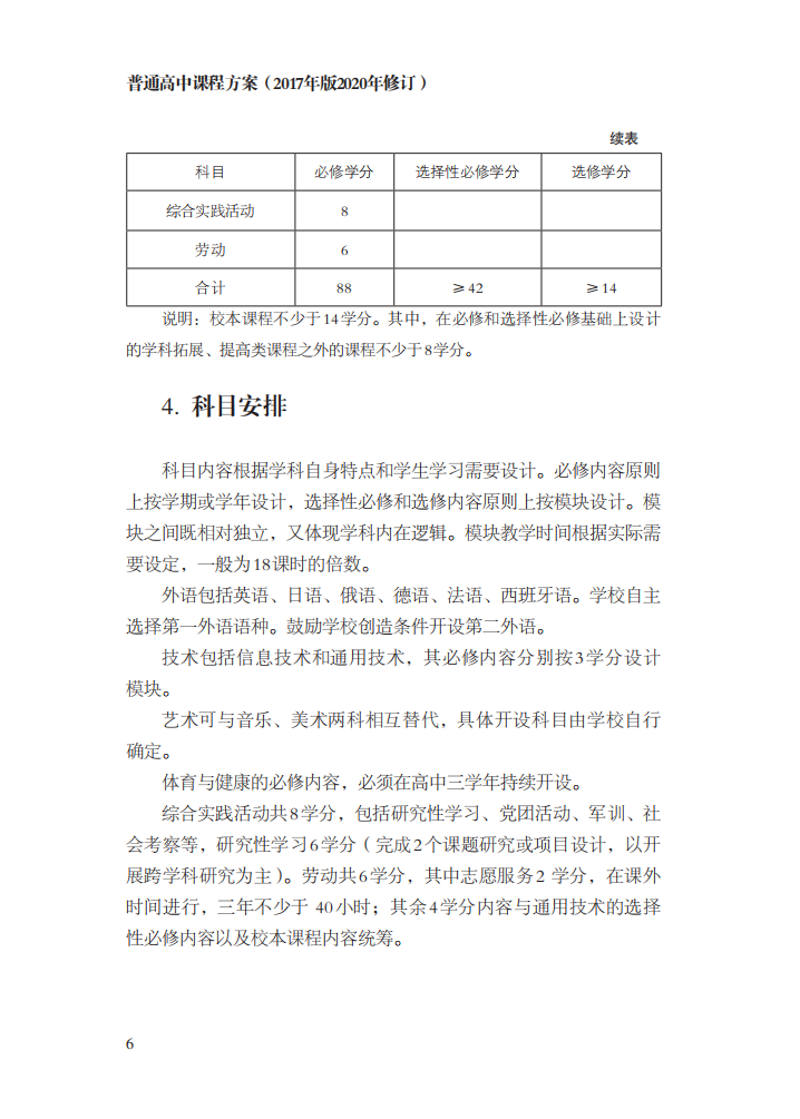 最新方案中,后面的科目设置与学分也有变化,方案要求,普通高中开设语文、数学、外语、思想政治、历史、地理、物理、化学、生物学、技术(含信息技术和通用技术)、艺术(或音乐、美术)、体育与健康科目和综合实践活动等国家课程以及校本课程之外,还应开设劳动课程,劳动共6学分,其中志愿服务2学分,在课外时间进行,三年不少于40小时;其余4学分内容与通用技术的选择性必修内容以及校本课程内容统筹。